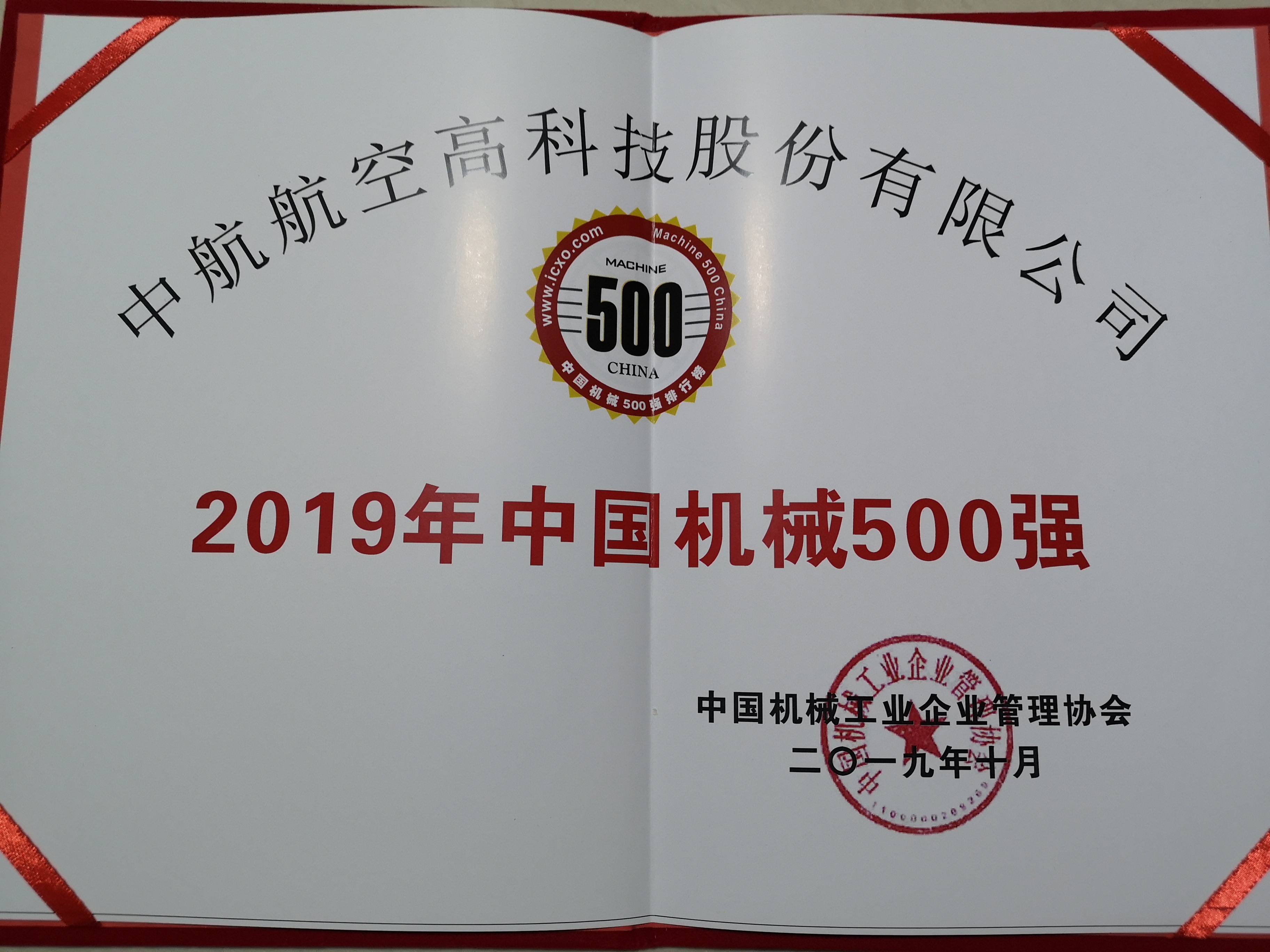 中航高科喜獲“2019中國機械工業(yè)500強”榮譽稱號
