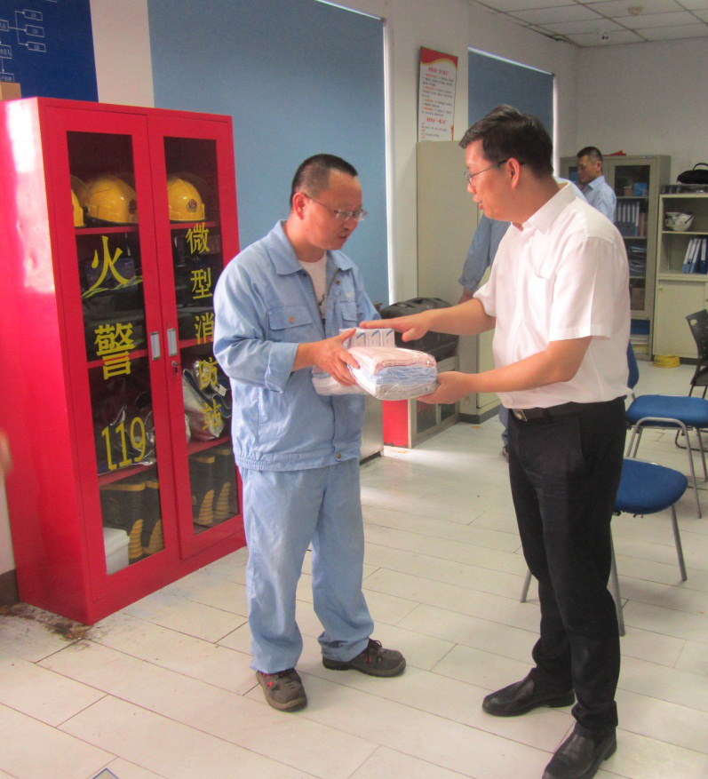 近日持續(xù)高溫, 8月18日下午,產(chǎn)控集團董事長張劍橋前往江山農(nóng)化、江天化學、醋酸化工等企業(yè)慰問堅守生產(chǎn)崗位的一線職工,送去毛巾、藿香正氣液、仁丹、風油精等防暑降溫物資。