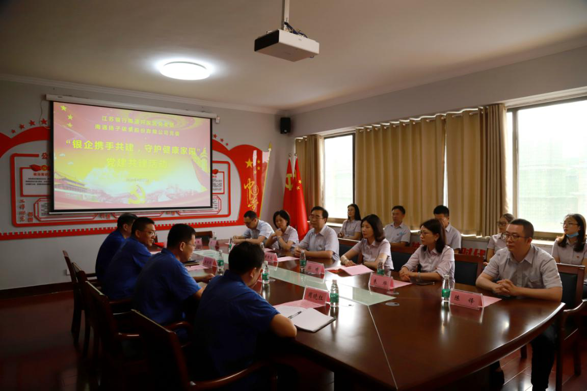為豐富黨建形式,提高黨建工作水平,延伸工作平臺(tái),8月27日,江蘇銀行南通分行黨委委員、副行長(zhǎng)黃世成率江蘇銀行南通開(kāi)發(fā)區(qū)黨支部與南通揚(yáng)子碳素股份有限公司黨委開(kāi)展“銀企攜手共建,守護(hù)健康家園”黨建共建活動(dòng)。揚(yáng)子碳素黨委書(shū)記、董事長(zhǎng)劉明、黨委委員、副總經(jīng)理、財(cái)務(wù)總監(jiān)王建華、黨委委員、副總經(jīng)理、工會(huì)主席周曉紅、黨委委員、紀(jì)委書(shū)記陸輝以及各黨支部書(shū)記參加此次活動(dòng)。